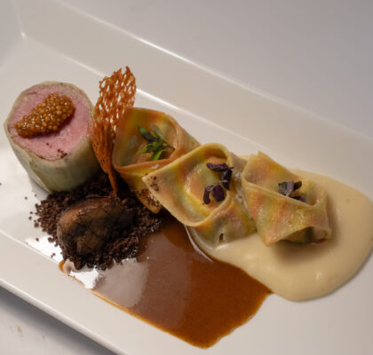 - Place 2 oz. kohlrabi purée in middle of plate and spread to a 4-5-inch diameter.