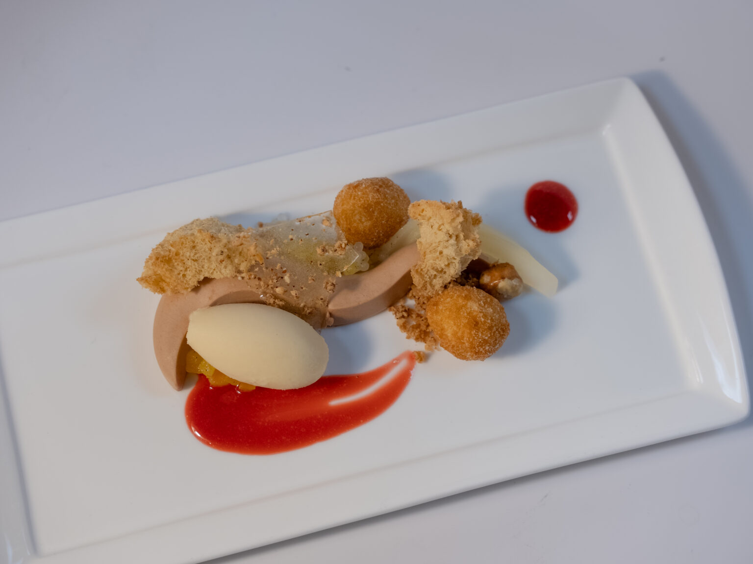 Gianduja Bavarian, Pineapple Sherbet, Blood Orange Sauce, Yuzu Poached Pear, Orange 'Salad,' Creme de Farine Croquette