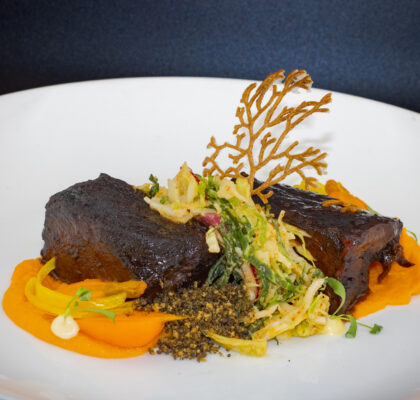 Grilled Buffalo Tenderloin with wild mushroom demi-glace, parsnip puree, smoked salt parsnip chip, grilled baby fennel, baby tomato salad