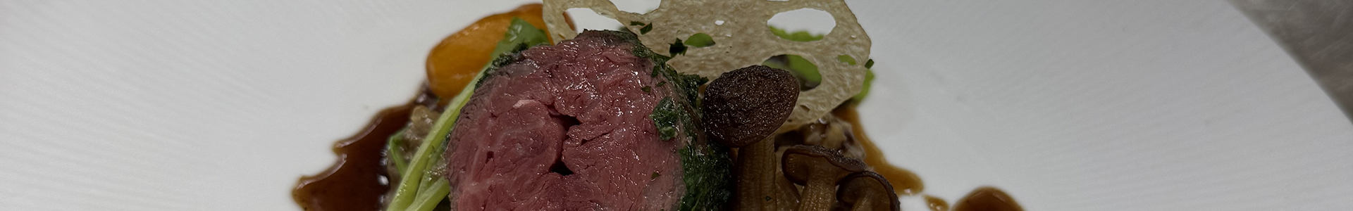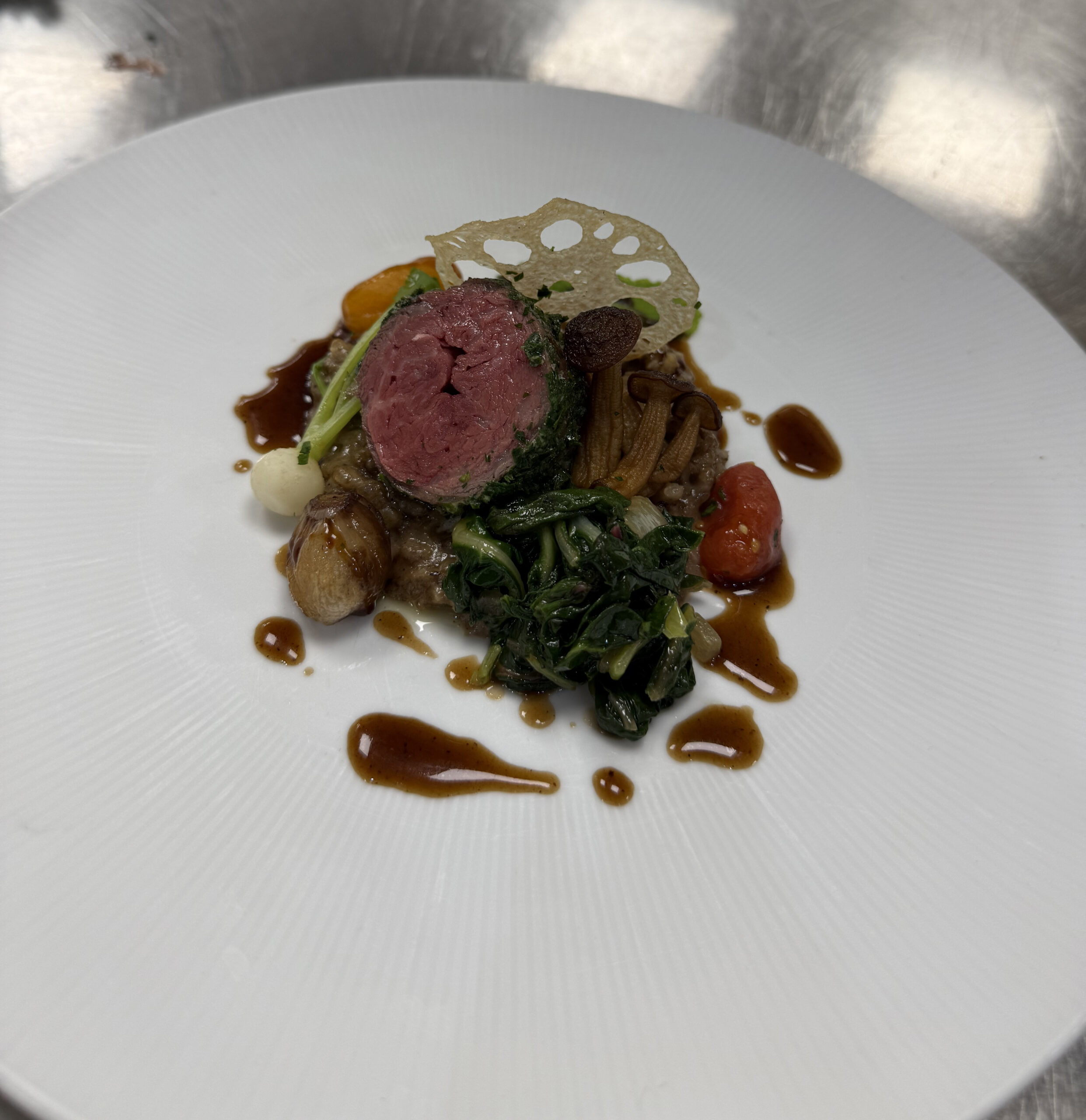 Seared Australian Wagyu Ribeye with porcini risotto, balsamic glazed pearl onions, baby heirloom tomato confit, sauteed Swiss chard, baby turnip, roasted brown straw mushrooms, crispy lotus root chip, roasted garlic and blue cheese butter, and rosemary veal jus