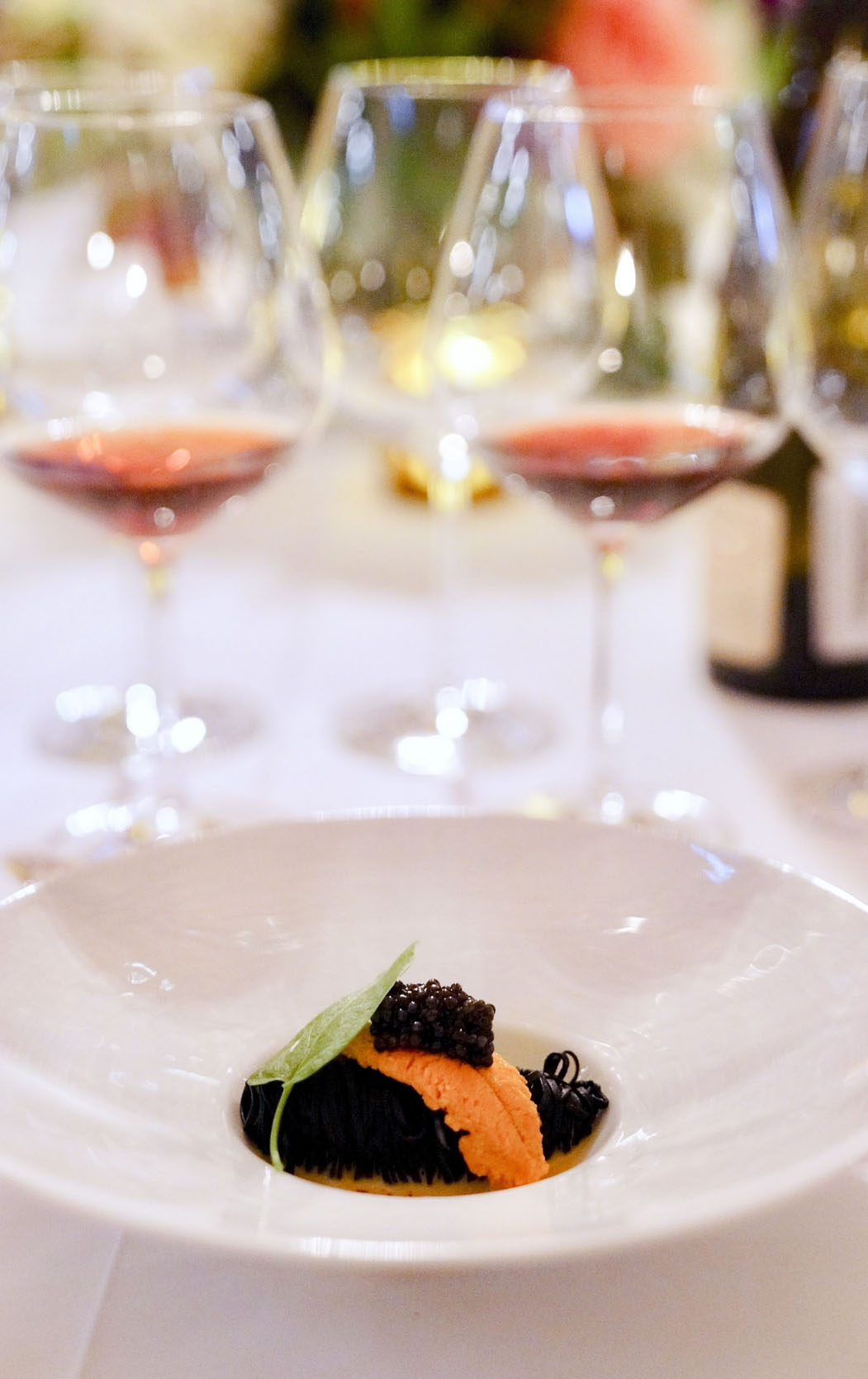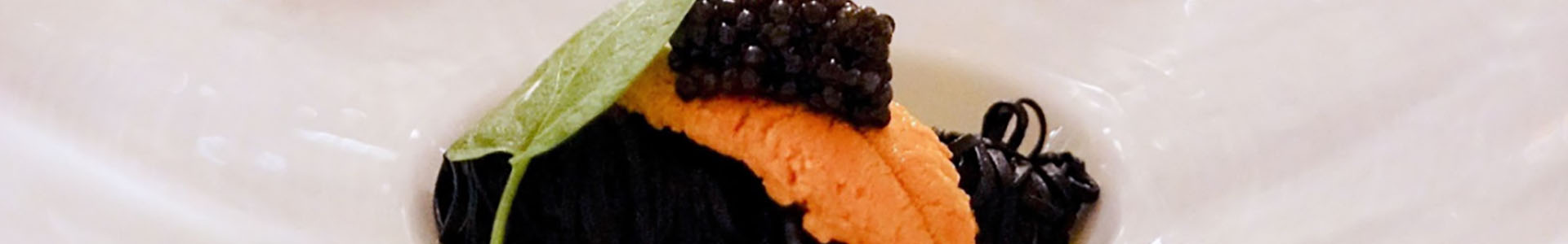 Squid Ink Pasta alla Chitarra with Espelette, Osetra Caviar, Uni and Lobster Emulsion
